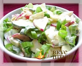 Листья салата тщательно промыть и нарезать, редис, помидоры, огурцы нарезать ломтиками, все перемешать, приправить майонезом. Пряности не добавлять.