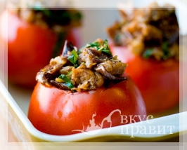 Продукты нарезать мелкими кубиками, все перемешать, заправить соусом «южный» и майонезом. Полученной массой заполнить подготовленные помидоры, выложить их на блюдо, красиво выстланное листьями салата. Помидоры можно фаршировать салатом из рыбы, рубленными крутыми яйцами с сельдыо, а также различными начинками на основе сырного или селедочного масла.