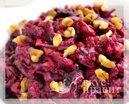 Свеклу натереть на крупной терке, чернослив (предварительно промытый и замоченный, очищенный от косточек) нарезать кусочками, всё перемешать, сбрызнуть соком лимона, посолить, приправить майонезом, смешанным со сметаной и сахаром.